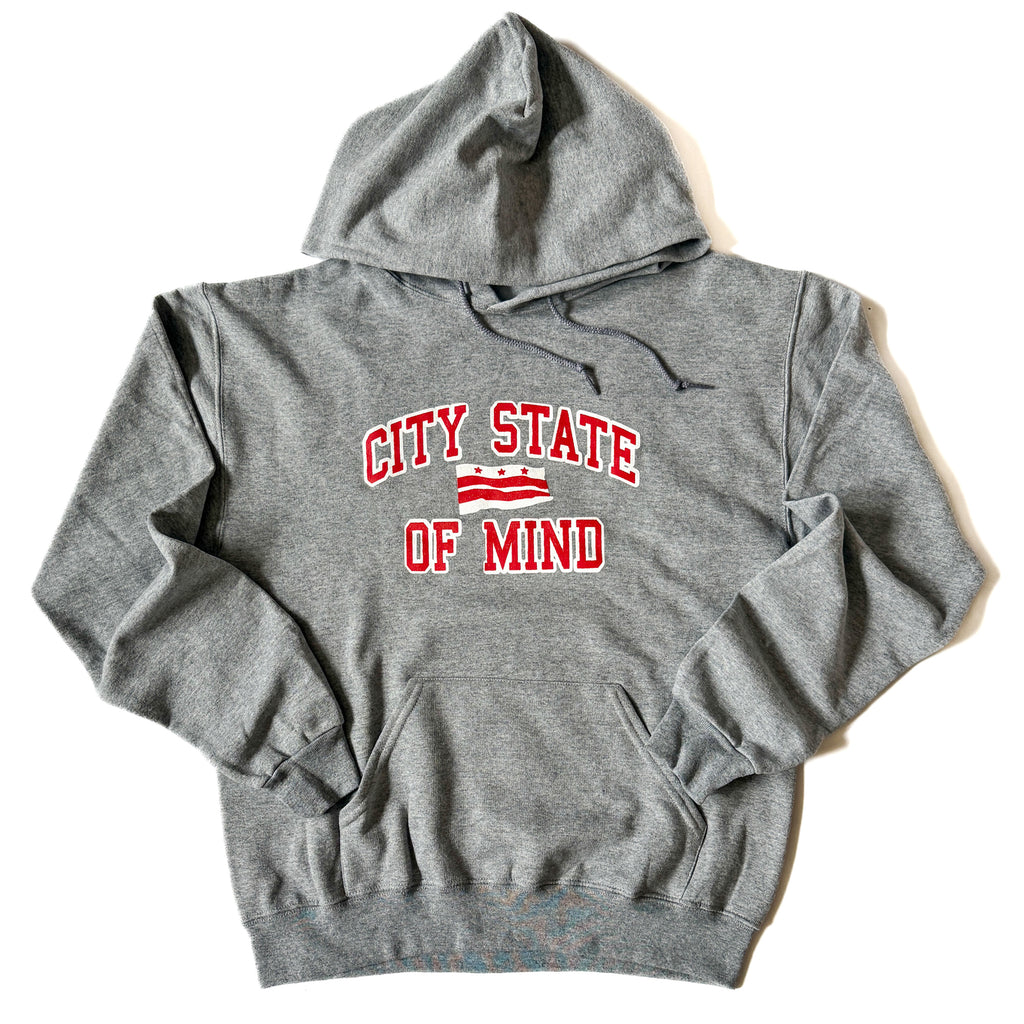 A play on words showing love for the District and advocating for D.C. Statehood, the hoodie features the phrase “City State of Mind’ in a collegiate style print and the D.C. flag at center chest.