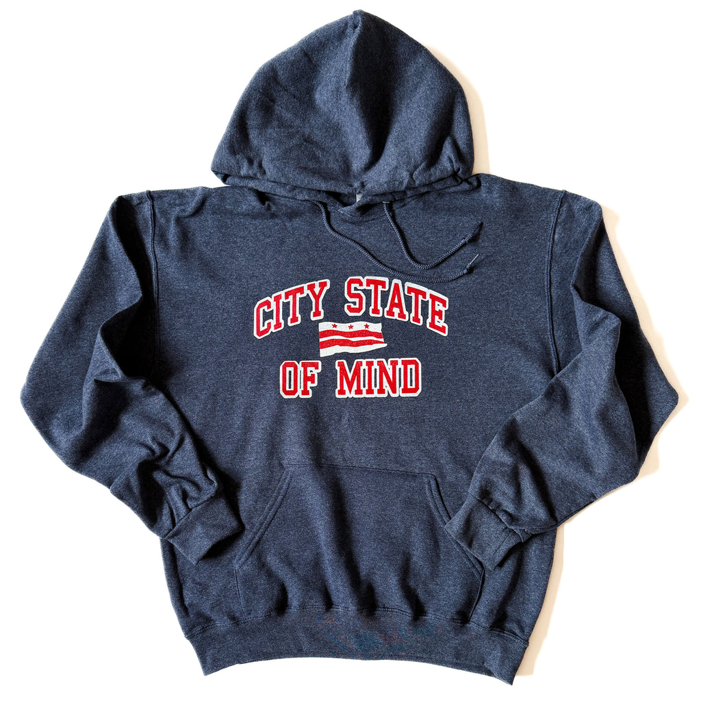 A play on words showing love for the District and advocating for D.C. Statehood, the hoodie features the phrase “City State of Mind’ in a collegiate style print and the D.C. flag at center chest.