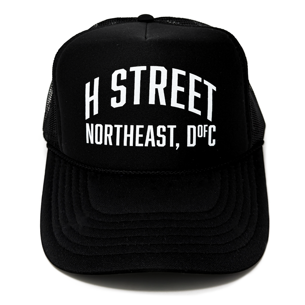 The trucker cap spells out in all caps ”H STREET” in an arch reminiscent of the bridge, nesting above “NORTHEAST D of C” as the bold graphic at center front.